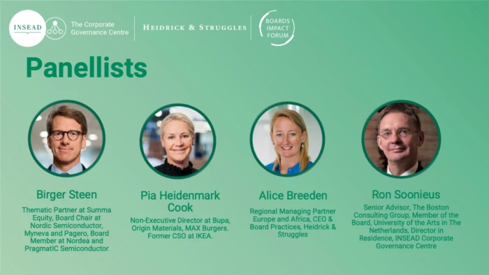 Recent research on the topic was presented by Alice Breeden (Heidrick & Struggles) and Ron Soonieus (INSEAD and Boston Consulting Group). The findings reveal a clear disconnect between what board members say about the importance of climate change and the actions taken by their companies. The presentation followed an interactive panel with Chair & NED Birger Steen (Nordea, Nordic Semiconductor, Myneva Group, Pagero and partner Summa Equity) and NED Pia Heidenmark Cook (Bupa, Origin Materials, Max Burgers, and former Chief Sustainability Officer at IKEA). Moderated by Sonia Tatar, Executive Director INSEAD ICGC.