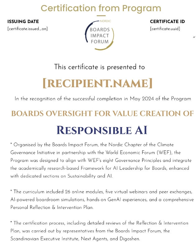 The certification is reviewed and confirmed by Boards Impact Forum , the Nordic Chapter of Climate Governance Initiative in collaboration with World Economic Forum , and its partners Scandinavian Executive Institute, Digoshen and Next Agents, and certifies that the participant has engaged in a significant part of the program, achieved the tests and developed a personal reflection and intervention plan with at least five interventions for its board(s).