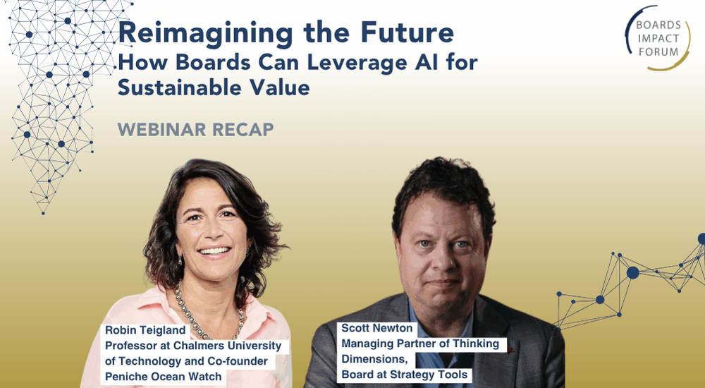 Artificial intelligence is transforming the way organizations create value and address sustainability challenges. In Boards Impact Forum’s recent webinar “Reimagining the Future: How Boards Can Leverage AI for Sustainable Value,” board directors and senior executives gathered to explore how AI can be embedded in governance, strategy, and purpose-driven leadership.