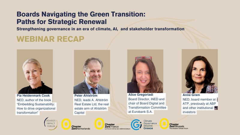 On 20 November 2025, Boards Impact Forum joined forces with Chapter Zero Netherlands, Chapter Zero France, Chapter Zero Brussels, and Climate Governance Initiative Greece, bringing together board directors and senior leaders from across Europe for a timely session exploring how boards can transform the green transition and AI shift into strategic renewal.