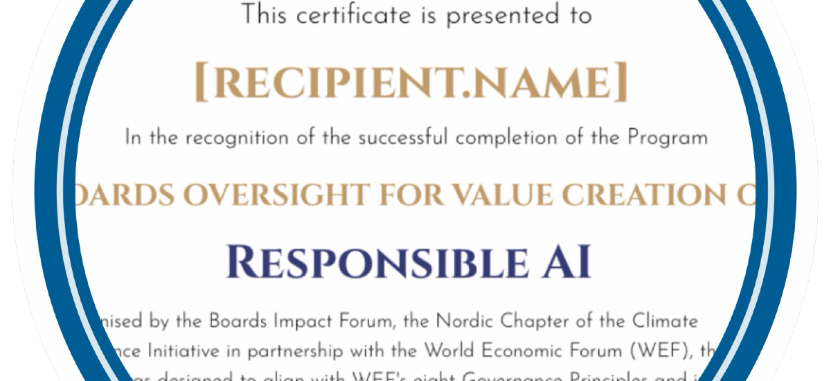 The certification is reviewed and confirmed by Boards Impact Forum , the Nordic Chapter of Climate Governance Initiative in collaboration with World Economic Forum , and its partners Scandinavian Executive Institute, Digoshen and Next Agents,