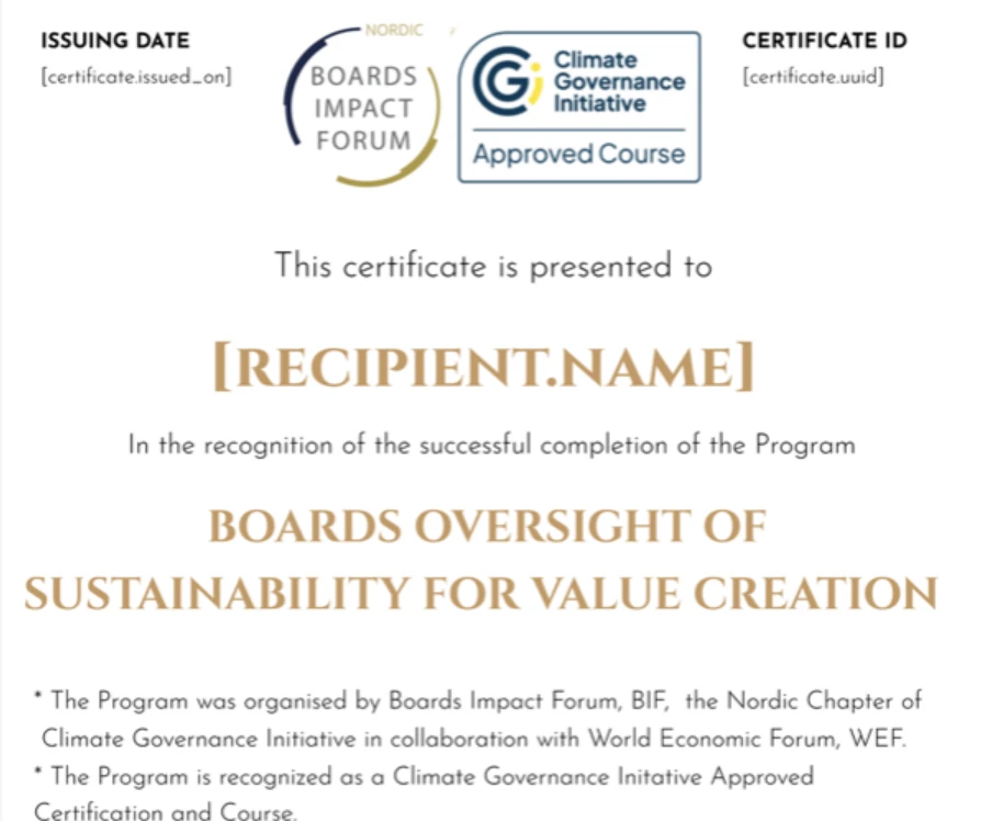 The certification is reviewed and confirmed by Boards Impact Forum , the Nordic Chapter of Climate Governance Initiative in collaboration with World Economic Forum , and its partners Scandinavian Executive Institute, Digoshen and Next Agents, acknowledged as a certified Course by Climate Governance Initiative and certifies that the participant has engaged in a significant part of the program, achieved the tests and developed a personal reflection and intervention plan with at least five interventions for its board(s).